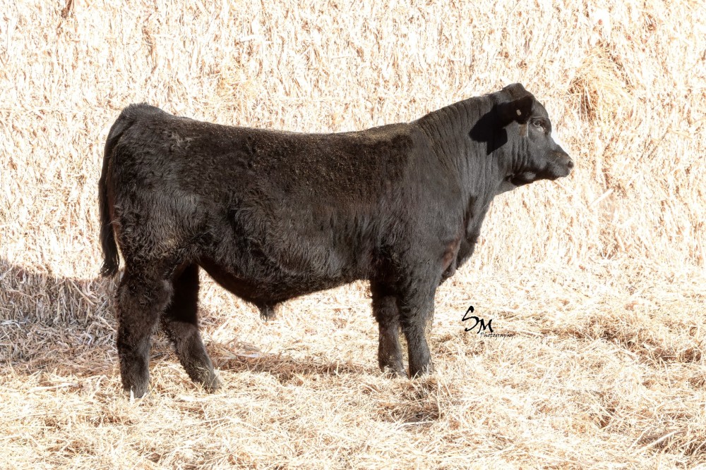 Here is a blaze faced bull by Dwyer Wallstreet. His mother G916 was our first Simm Angus purchase and she has been a good cow. Her first calf was the J16 bull we had calves out of in the sale the past couple years. She has a great udder and is very correct in her structure.